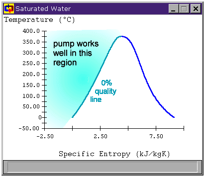 This is a statepoint when our own knowledge and reasoning about cycles is key to making assumptions. The only reason we have a cooler before the pump at all is because we know pumps can be damaged by non-liquids. To avoid this, the cooler must condense all of the steam leaving the turbine into a liquid before we send it to the pump. So we at least want to cool our saturated working fluid to 0% quality before sending it to the pump. Figure 4 shows the region to which we must cool the working fluid before safely using a pump.