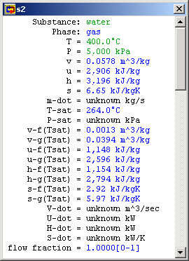 When T and P have been entered, CyclePad pauses for a second and figures out the other intensive properties at this statepoint, like specific volume, specific internal energy, et cetera. If we were doing this problem by hand, these are all values we would have to look up in tables.
